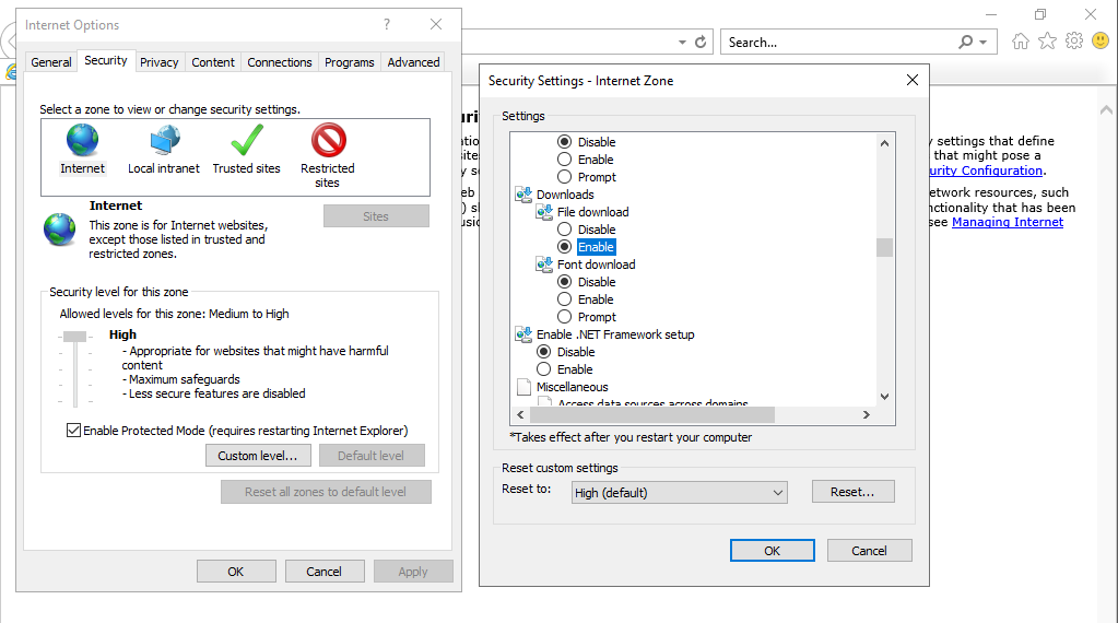 Internet Explorer may be locked down and downloads may be disabled. To enable downloads, go to Internet Options > Security Settings > scroll down to Downloads > Enable