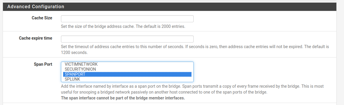 Next, select "Display Advanced" and select SPANPORT as the span port. This will allow the frames received by the bridge from the VICTIMNETWORK to be copied to the span port. The frames will then be sent to Security Onion on EM4/VMNET5.