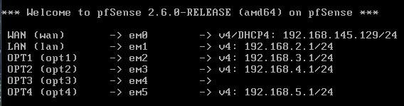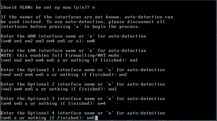 After responding to the prompts for each interface, pfSense will provide a list of assigned interfaces.