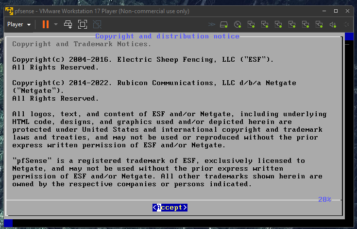 Power on the pfSense machine and accept the defaults.