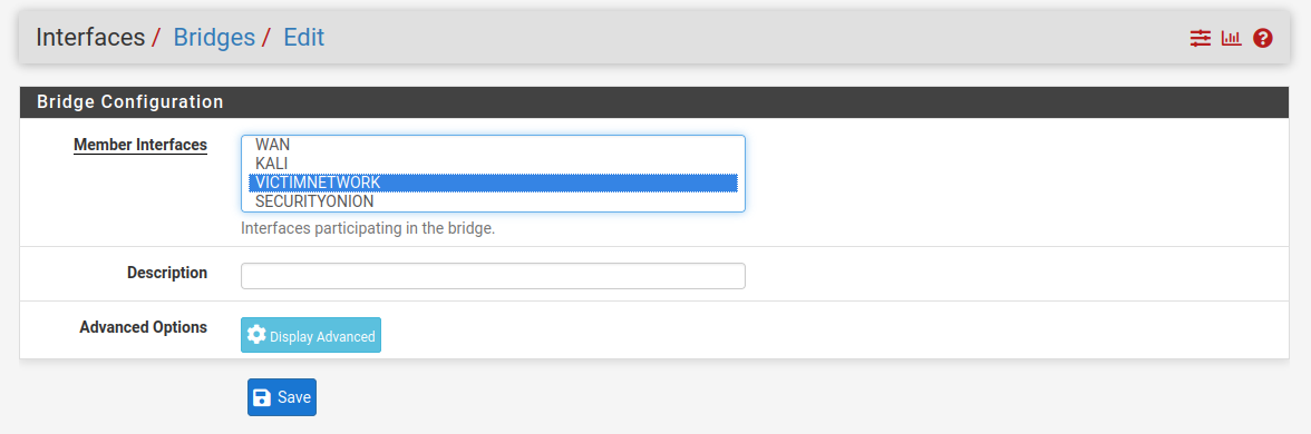 Add the VICTIMNETWORK as a member interface for the bridge.