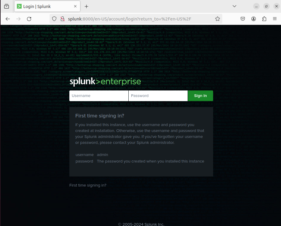 Navigate to the Splunk web interface: <http://splunk:8000>