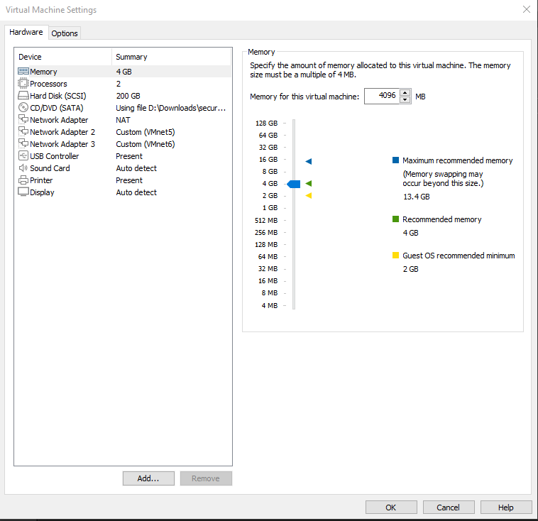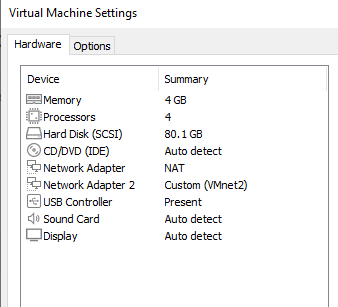 For this server, I configured the memory to 4GB, provided 100GB of Hard Disk storage, and added a network adapter for VMnet6.