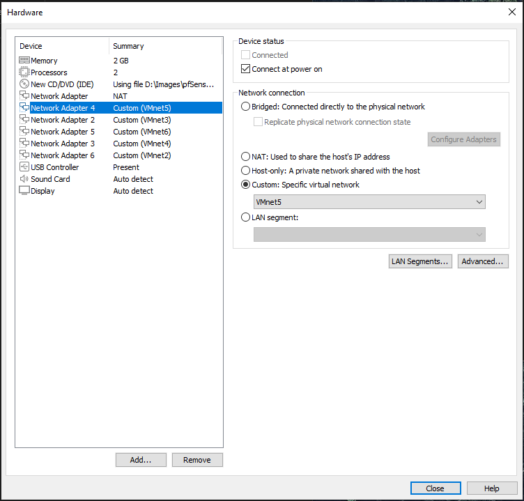 Add 5 additional network adapters. These will be used for network segmentation.